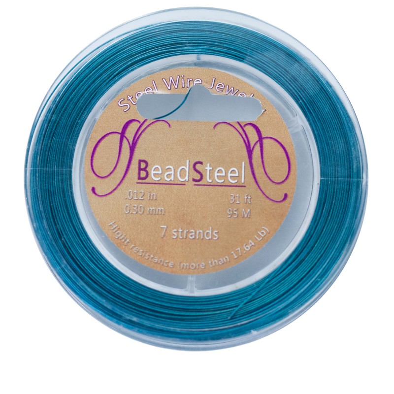 - Fil d’acier composé de 7 fils turquoise. La bobine mesure 95 mètres et l’épaisseur du fil est de 0,30 mm.