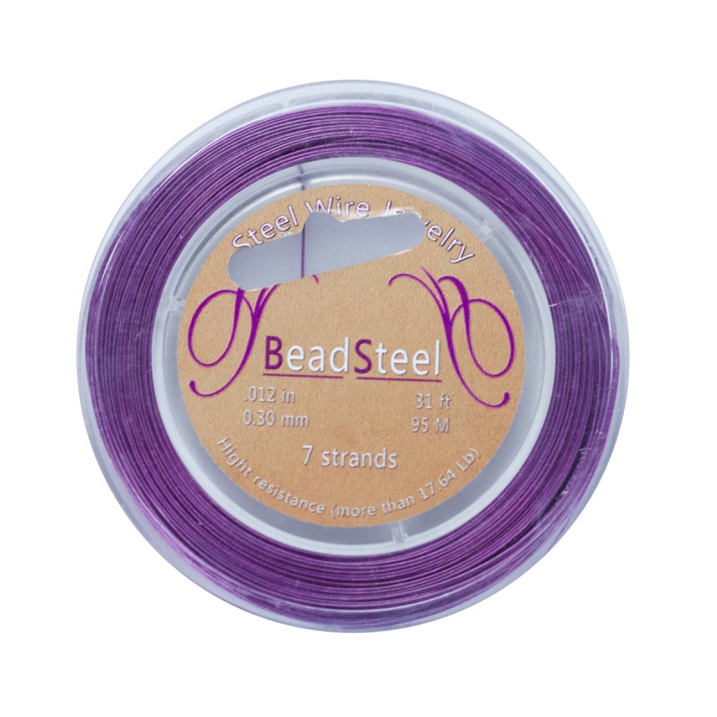 - Fil d’acier composé de 7 fils violets. La bobine mesure 95 mètres et l’épaisseur du fil est de 0,30 mm.