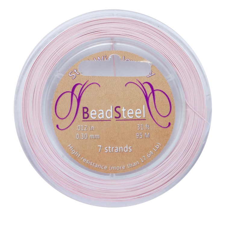 - Fil d’acier composé de 7 fils roses. La bobine mesure 95 mètres et l’épaisseur du fil est de 0,30 mm.