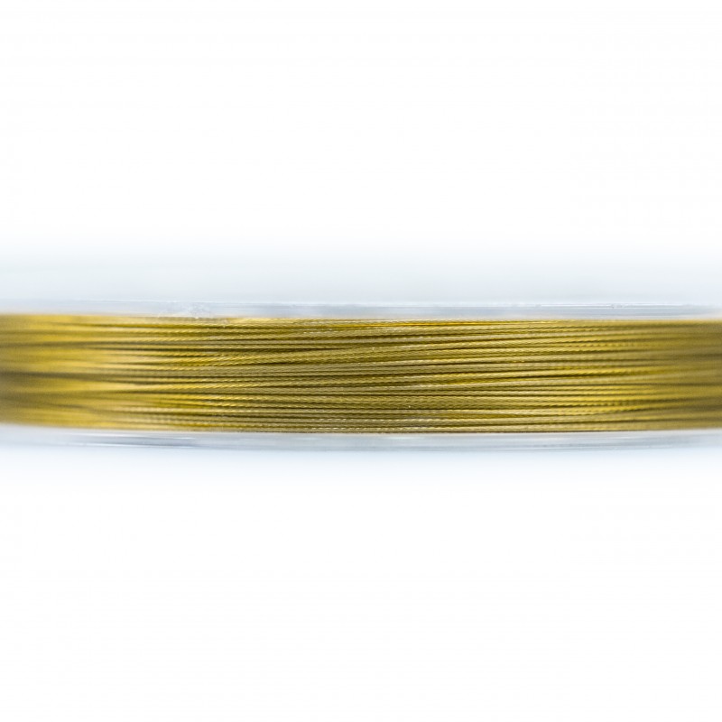 - Fil d’acier composé de 7 fils d’or. La bobine mesure 95 mètres et l’épaisseur du fil est de 0,30 mm.