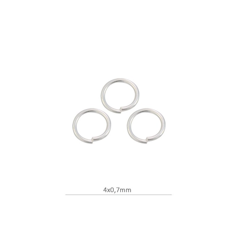 - Bague ronde ouverte en laiton de couleur argent. - Taille de 4x0,7 millimètres. - Le prix est par sac et le sac contient 20 unités.