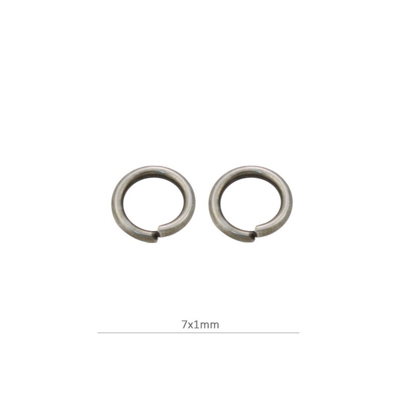 - Bague ronde ouverte en laiton de couleur argent ancienne. - La taille est de 7x1 millimètres. - Le prix est par sac et le sac contient 10 unités.