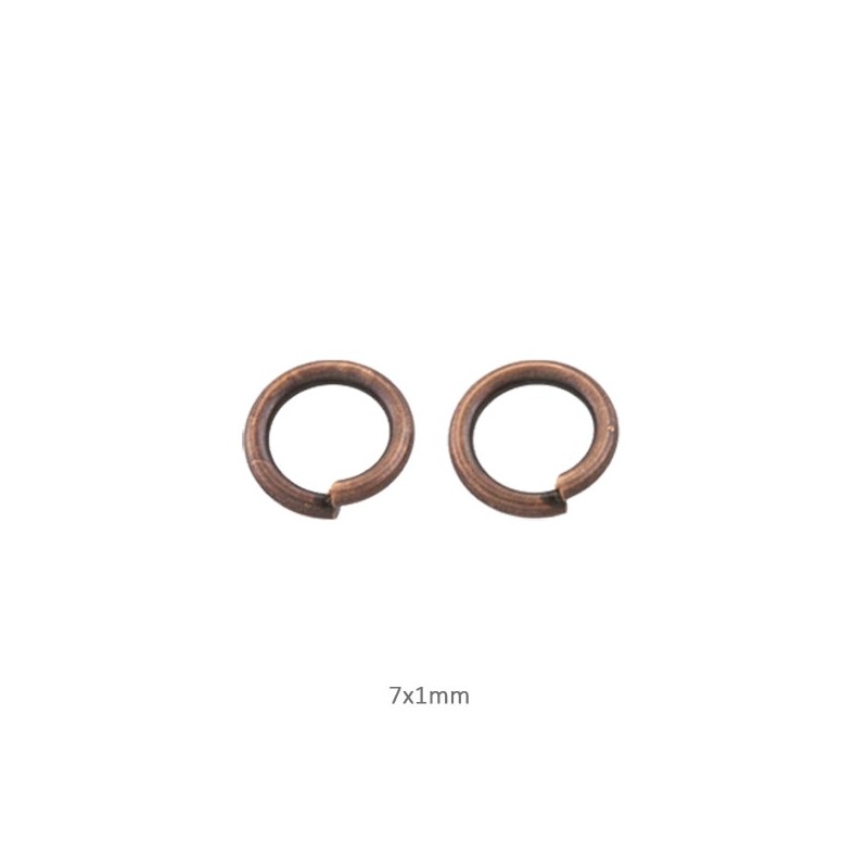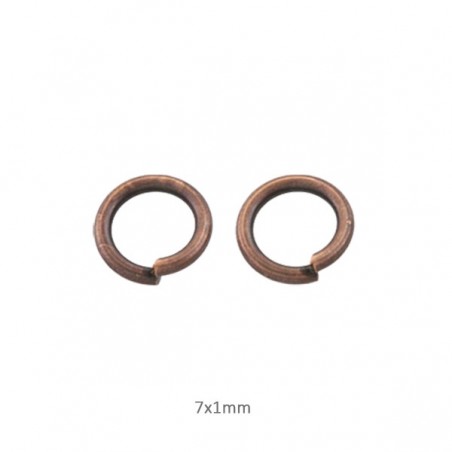 - Anneau rond ouvert en laiton de couleur cuivre. - Taille de 7x1 millimètres. - Le prix est par sac et le sac contient 10 unités.