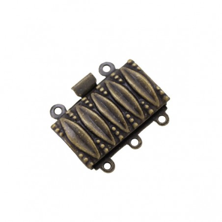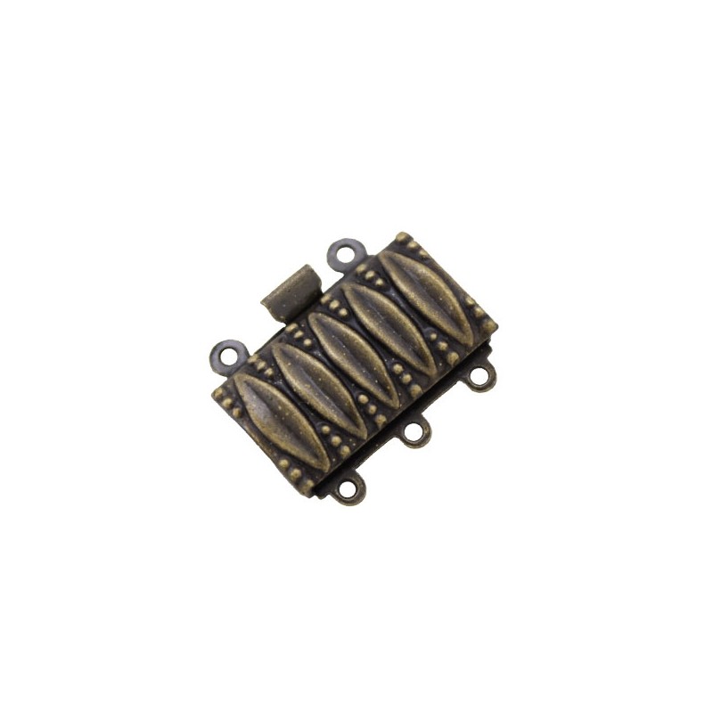 Fermoir de boîtier en laiton granulé à 3 tour de couleur or ancienne. Le sac contient 1 unité. La taille est de 19x13 mm. et a des trous de 1,5 mm.