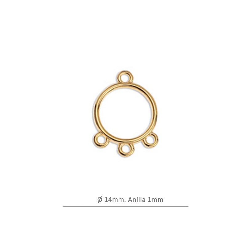 Cerceau intercalaire avec 3 anneaux en zamac avec bain d’or. Le sac contient 2 unités. La taille est de 14 mm.