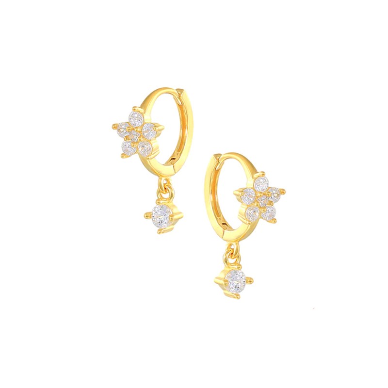 Boucles d’oreilles créoles automatiques avec fleur et mini colgantito en argent 925 baignées d’or 18 carats avec des zircons blancs.
