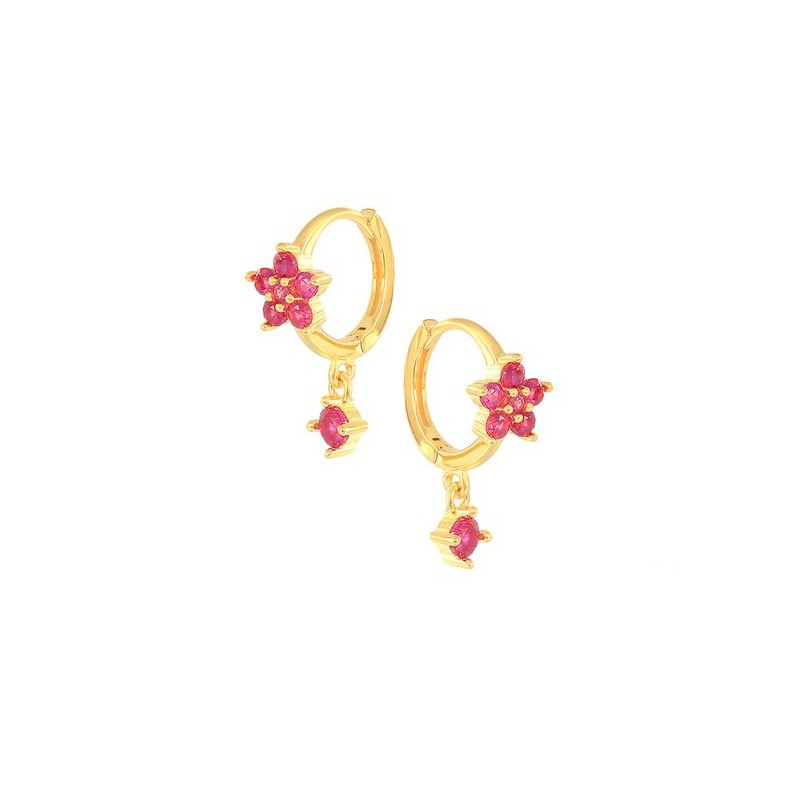 Boucles d’oreilles créoles automatiques avec fleur et mini colgantito en argent 925 baignées d’or 18 carats avec zircons en rubi.