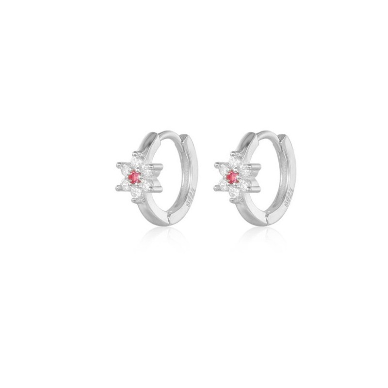 Créole fleur zirconite blanc et grenat 11.5mm. Argent 925