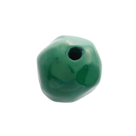 - Boule de résine en vert bouteille. - Taille de 12 à 14 millimètres. - Perceuse 3 millimètres. - Base plate et forme irrégulière.