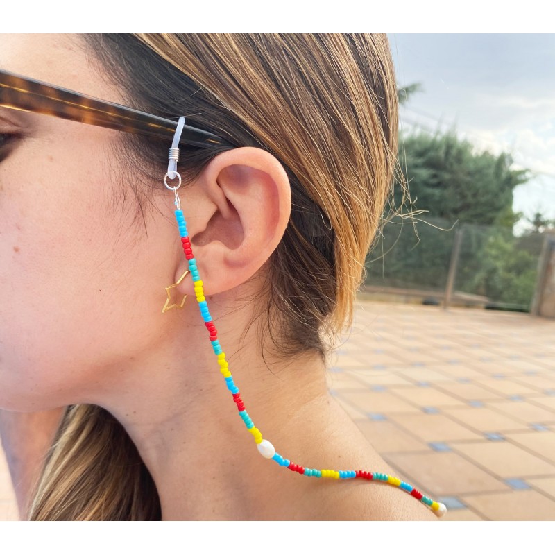 Les cordes à lunettes sont super faciles à fabriquer. La longueur de la chaîne de lunettes est d’environ 65 cm. Nous vous recommandons de travailler avec 2,5 mètres et demi de fil qui, une fois que vous le passez à travers l’aiguille et que vous le mettez deux fois, il restera à 1,25 cm.