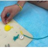 Le tour de cou chaîne a une longueur d’environ 40 cm selon la personne. Nous vous recommandons donc de couper un fil de 1,6 mètre qui, une fois passé à travers l’aiguille, sera double avec une longueur de 80 cm.