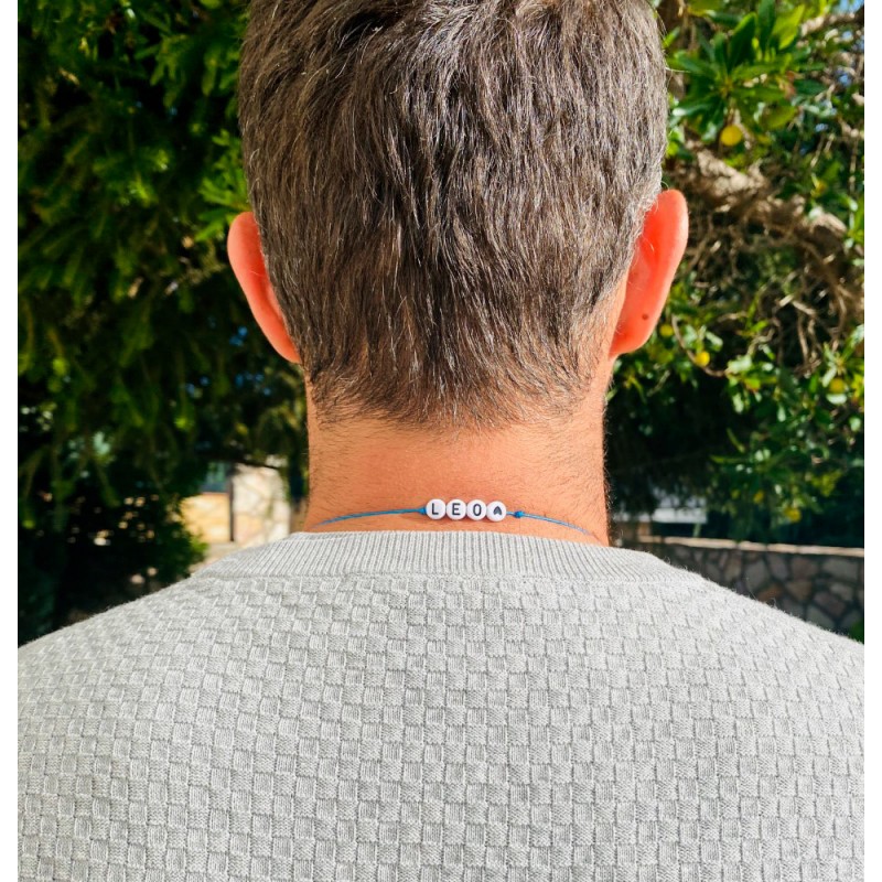 1. Nous passons les perles avec le nom au milieu du cordon.