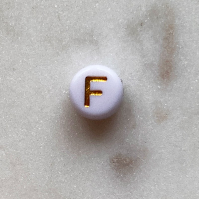 Perle de couleur dorée lettre F. Diamètre 8mm. Perceuse 1mm
