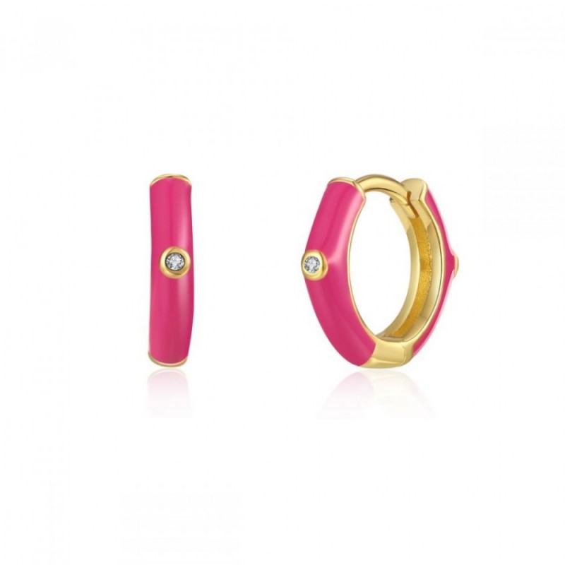 Boucles d'oreilles créoles automatiques en argent 925 doré or 18 carats avec zircone blanche et émail fuchsia.