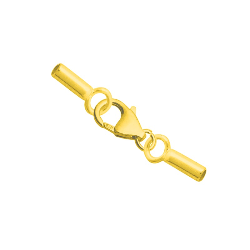 Embout tube monté avec mousqueton pour cordon 1,5 mm. Le tube mesure 8 mm de long et 2 mm à l'intérieur en argent 925 doré. Fabriqué en Espagne.