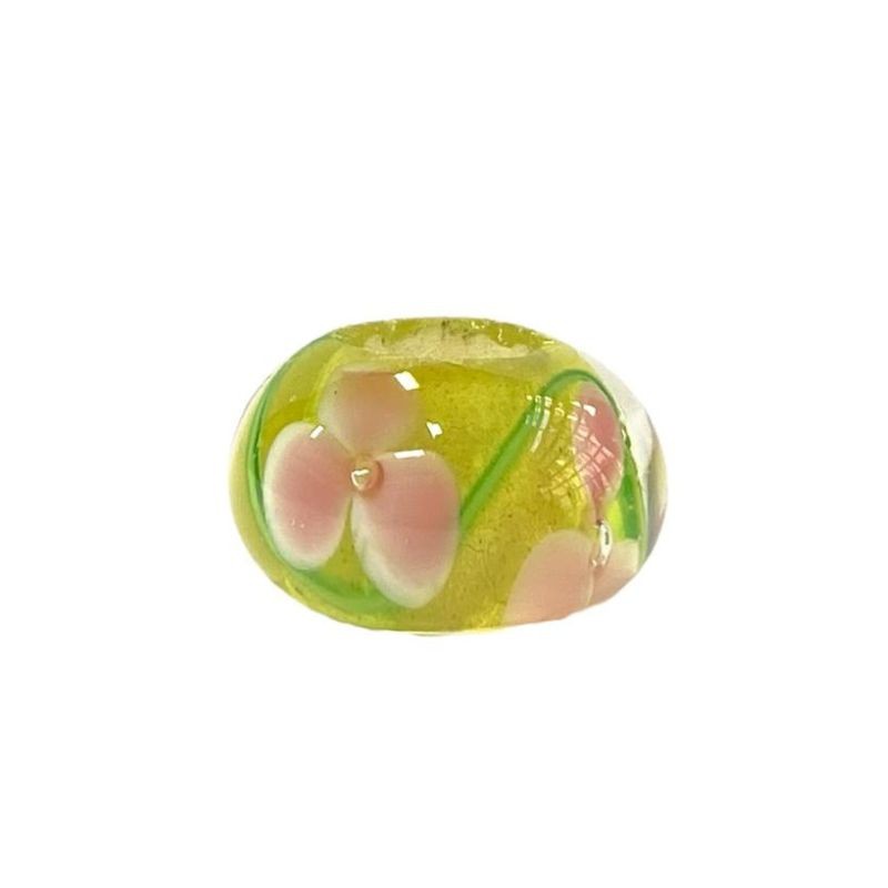 Le verre de Murano compte 14 x 8 mm pour uncordon de 5 mm. Jaune à fleurs roses