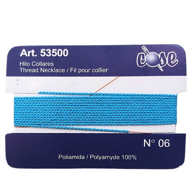 Fil pour enfiler les colliers n°6 de couleur turquoise avec aiguille incluse. 2 mètres de long.
