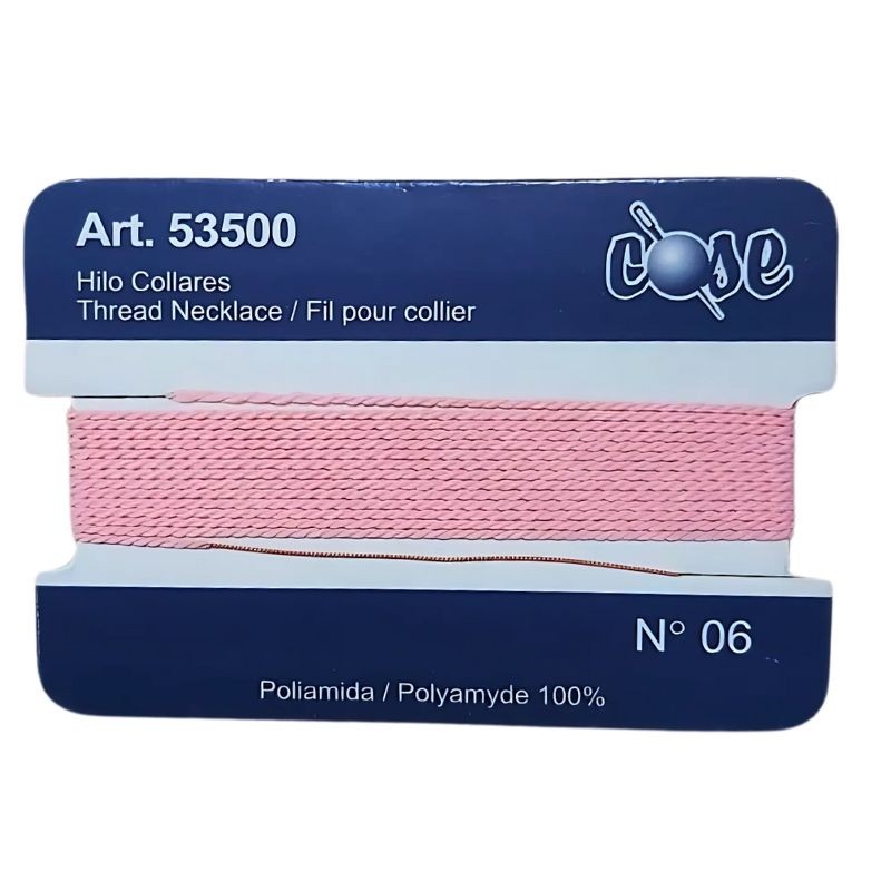 Fil pour enfiler les colliers n°6 de couleur rose avec aiguille incluse. 2 mètres de long.