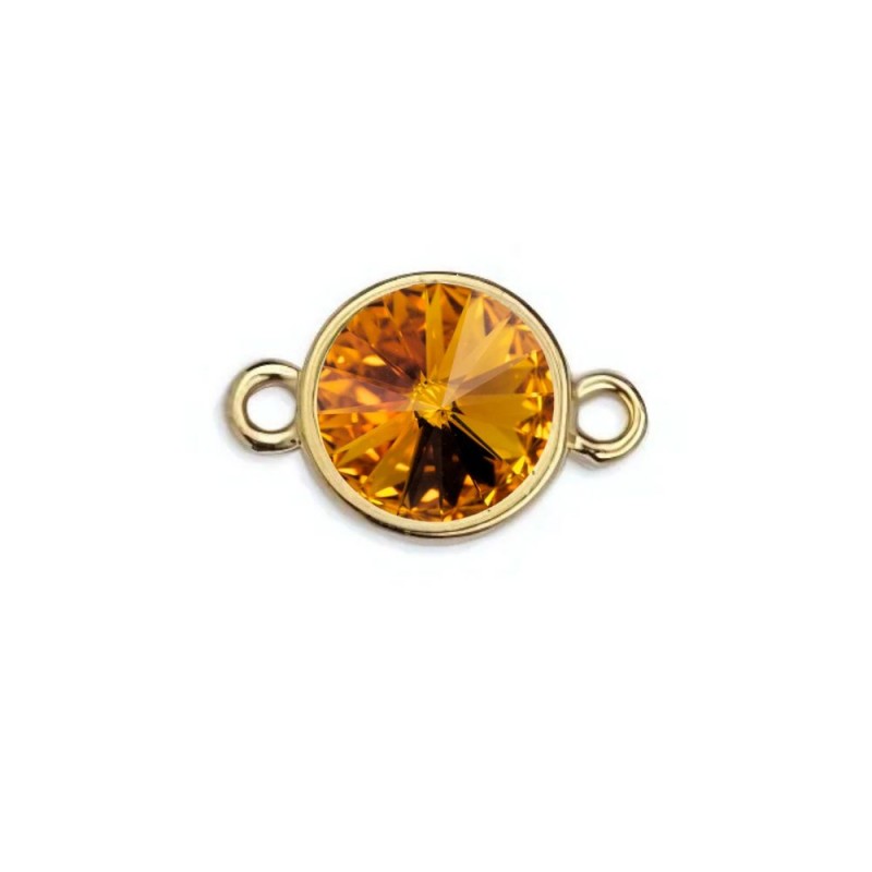Intercalaire en zamak plaqué or avec rivoli couleur Topaz. Nous vous conseillons de coller les deux pièces ensemble à l'aide de notre colle spéciale bijoux, référence 7405.