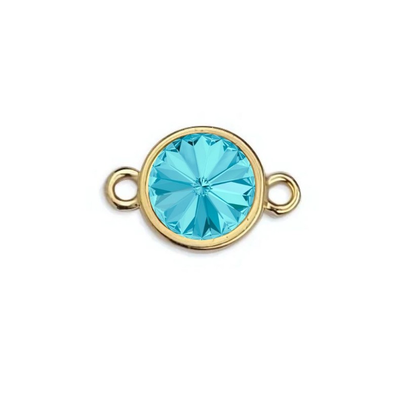 Intercalaire en zamak plaqué or avec rivoli couleur Aquamarine. Nous vous conseillons de coller les deux pièces ensemble à l'aide de notre colle spéciale bijoux, référence 7405.