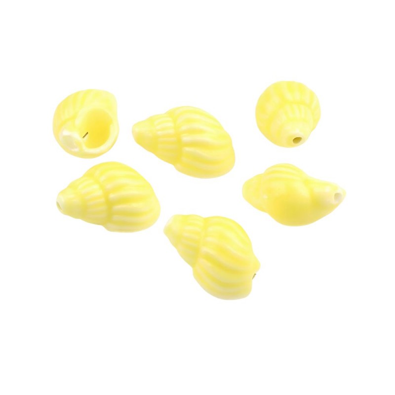 Perle en céramique en forme de coquillage de 21 mm de long avec trou traversant de 2 mm de couleur jaune pastel.