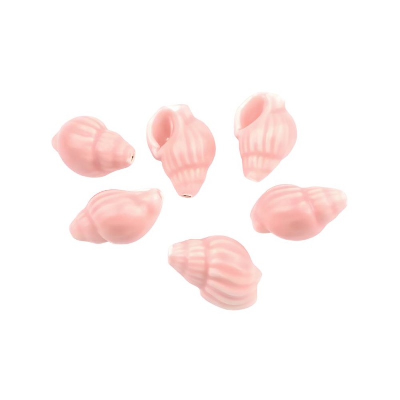 Perle en céramique en forme de coquillage de 21 mm de long avec trou traversant de 2 mm de couleur rose pâle.