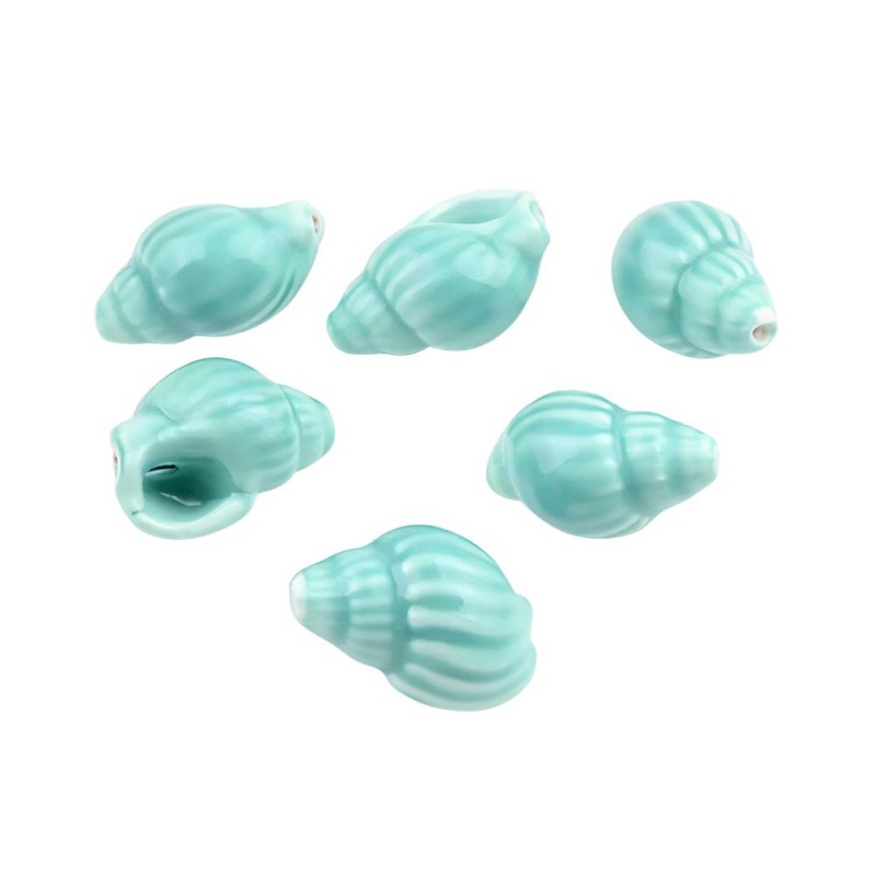 Perle en céramique en forme de coquillage de 21 mm de long avec trou traversant de 2 mm de couleur bleu turquoise.