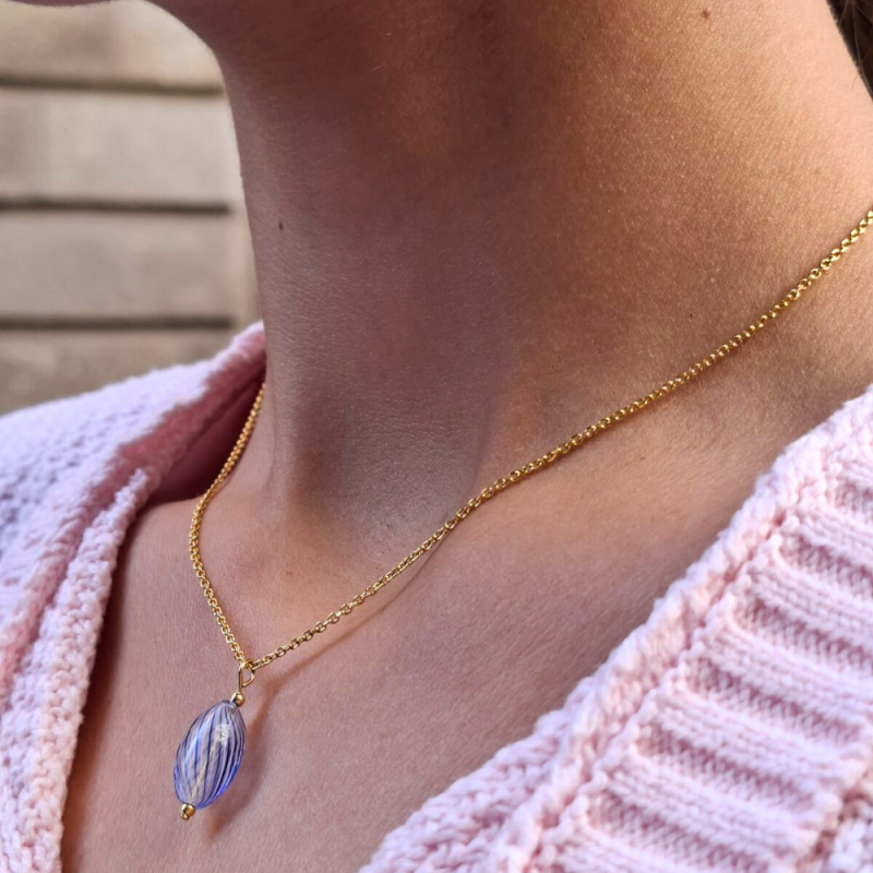Verre soufflé en forme de goutte, 13 x 8 mm. Bleu rayé.