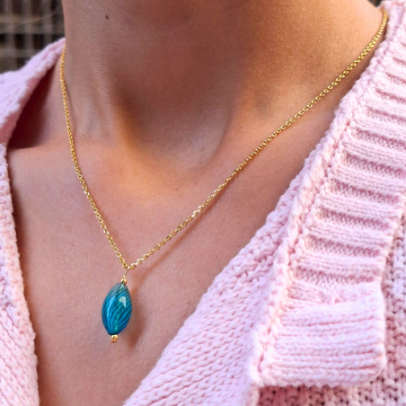 Verre soufflé en forme de larme 13x8mm de couleur bleue turquoise avec rayures. Alésage 1mm.