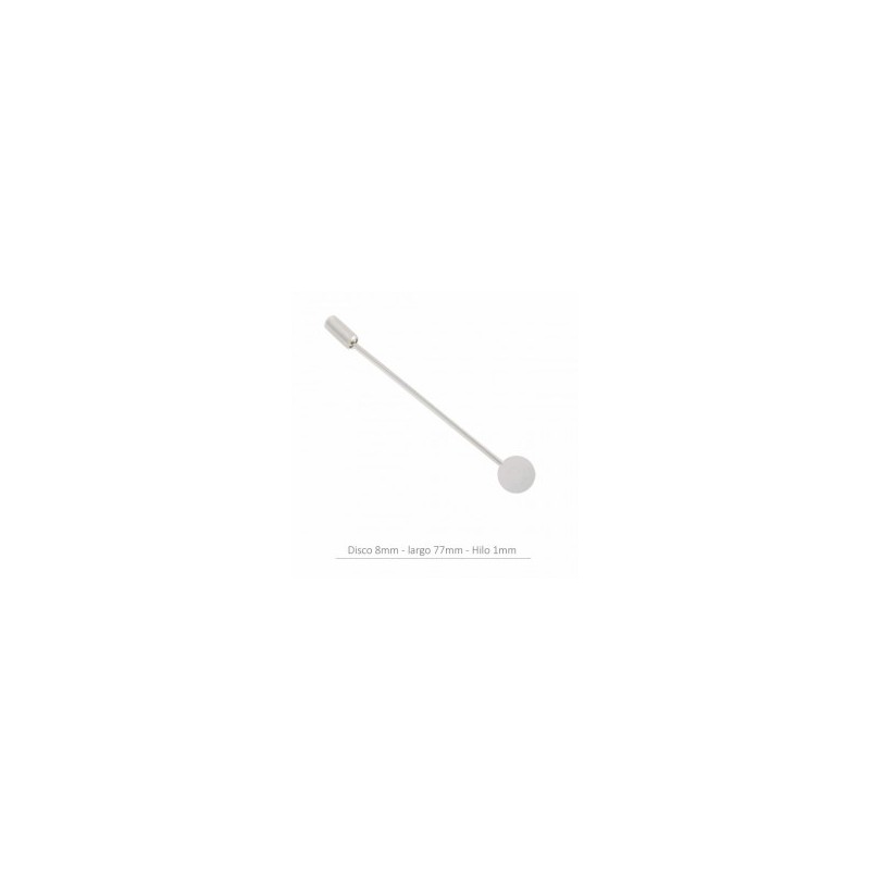 Brochette avec disque lisse et bouchon, de petite taille, en argent 925. Le sac contient 1 unité. La longueur est de 65 mm et le diamètre du disque est de 8 mm.