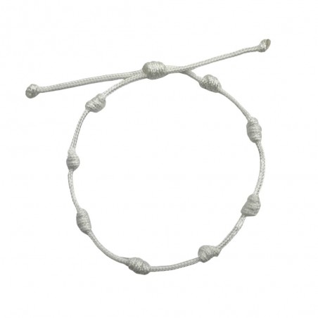 Bracelet à nœuds réalisé avec un fil de macramé de 1,5 mm de couleur blanche. Il est ajustable grâce à un nœud coulissant.
