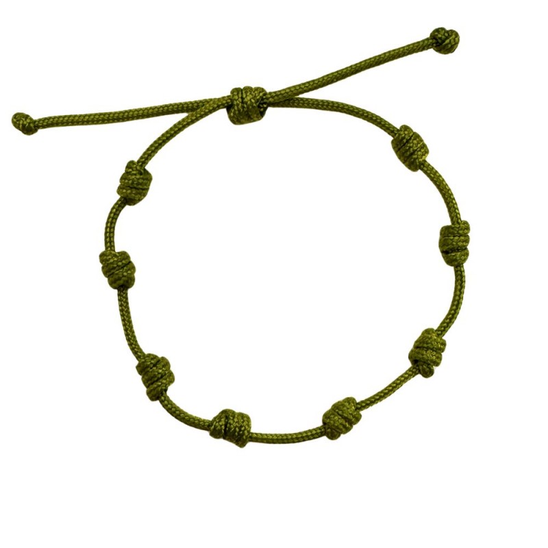 Bracelet à nœuds réalisé avec un fil de macramé de 1,5 mm de couleur olive. Il est ajustable grâce à un nœud coulissant.