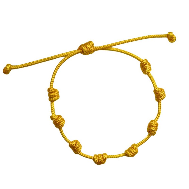 Bracelet à nœuds réalisé avec un fil de macramé de 1,5 mm de couleur jaune. Il est ajustable grâce à un nœud coulissant.
