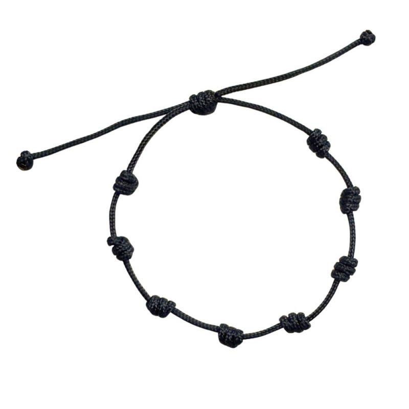 Bracelet à nœuds réalisé avec un fil de macramé de 1,5 mm de couleur noir. Il est ajustable grâce à un nœud coulissant.