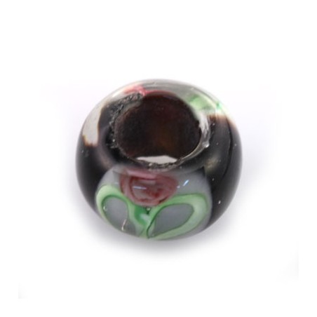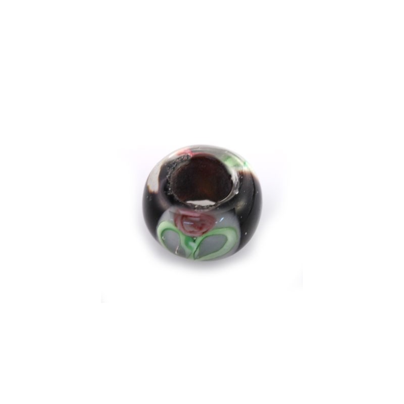 Compte en verre de Murano 13 x 7 mm pour cordon de 6 mm, en noir avec imprimé fleur.