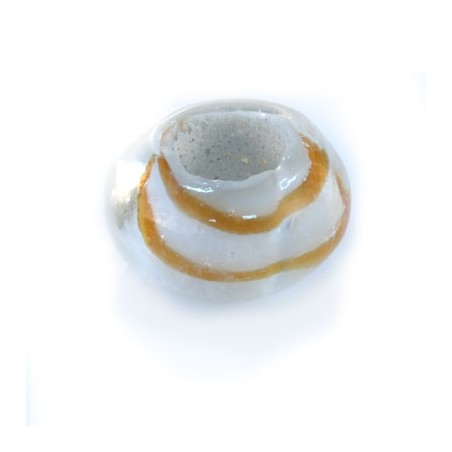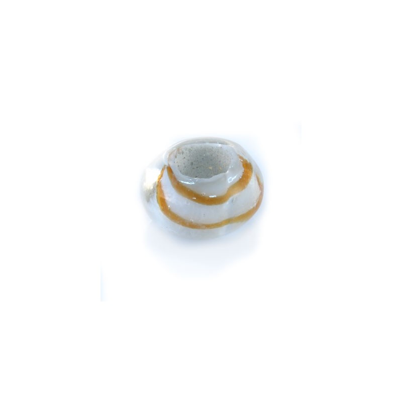 Le verre de Murano a 14x8 mm pour un cordon de 6 mm. Blanc avec spirales orange.
