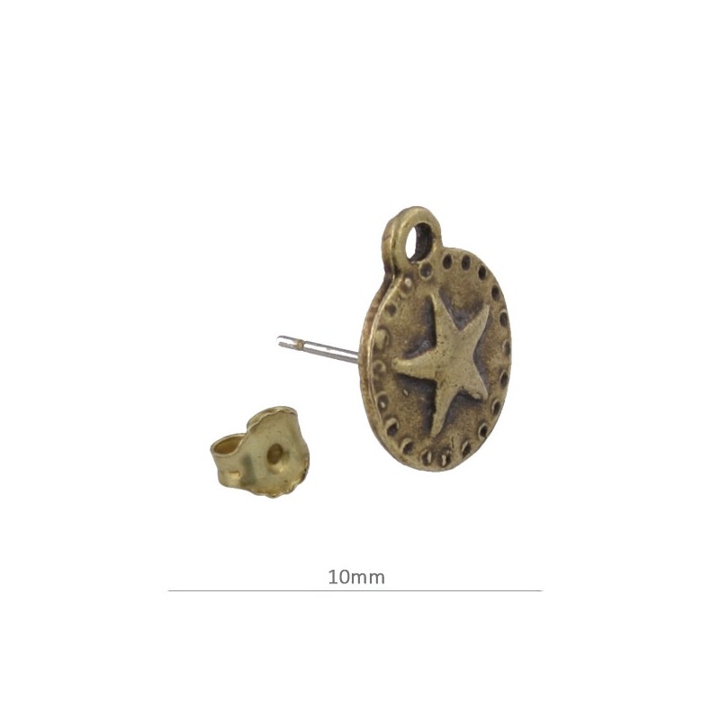 - Boucle d’oreille en étoile dans zamac avec vieux doré. - La taille est de 10 mm. - Le prix est par sac et le sac contient 2 unités.