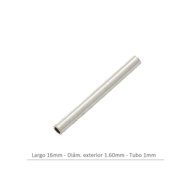 Tubo para nylon, silicona o cable acero, en plata de ley. La bolsa contiene 2 unidades y el tamaño es de 16x1.60mm. El diámetro interior o tubo es de 1mm.