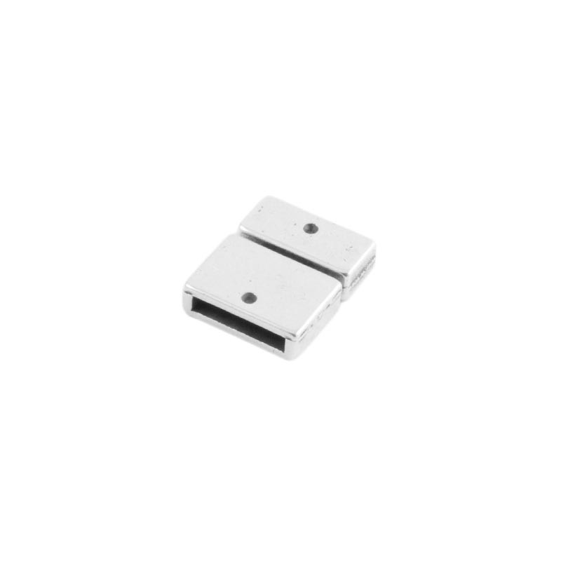 Fermoir en T dans zamac avec argenté. Le sac contient 1 unité. La taille est de 18x12 mm. et est pour un cordon plat de 13 mm.