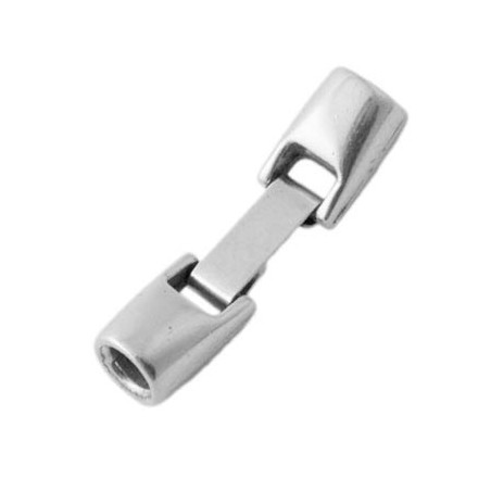 Fermoir avec onglet « clic » dans zamac avec argenté. Le sac contient 1 unité. La taille est de 38X10 mm. et est pour un cordon de 5 mm.