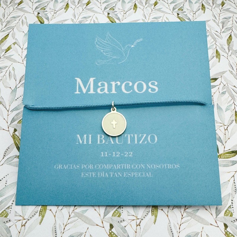 Carte carrée en carton avec motif baptême pigeon, spéciale pour emballer vos détails. Vous pouvez faire deux découpes en haut et y accrocher le pendentif. Egalement deux trous au milieu et mettre les boucles d'oreilles et enfin deux découpes de chaque côté de la carte pour les bracelets.