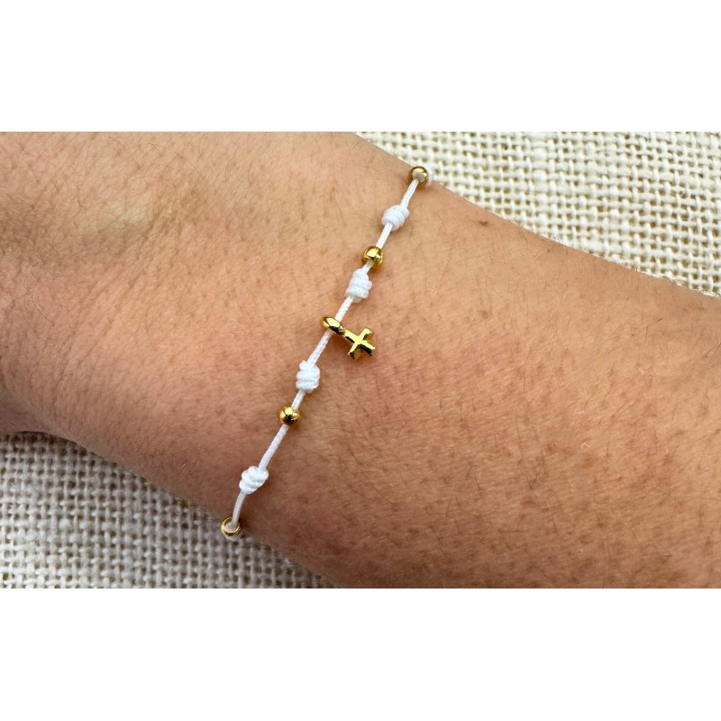 Surprenez vos invités en créant à la main les détails de votre fête de baptême ou de communion, en leur offrant ce joli bracelet avec pendentif en forme de croix, qu’ils pourront porter tous les jours pour se souvenir de cette belle journée. La couleur du cordon sur la photo est blanc