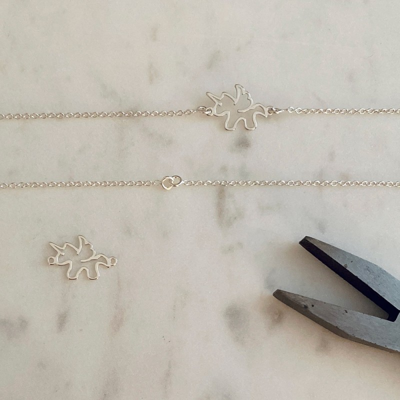 - Intercalaire licorne en argent 925. - Convient pour pendentif et intercalaire. - La taille est de 17x11 millimètres et a deux anneaux de 1,3 mm. - Le prix est par unité.