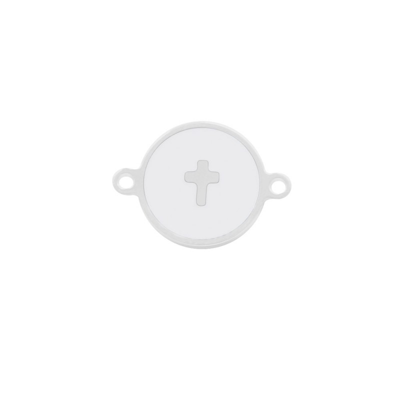 Croix Intercalaire émaillée en blanc avec deux Anneaux en argent 925, fabriquée en Espagne.