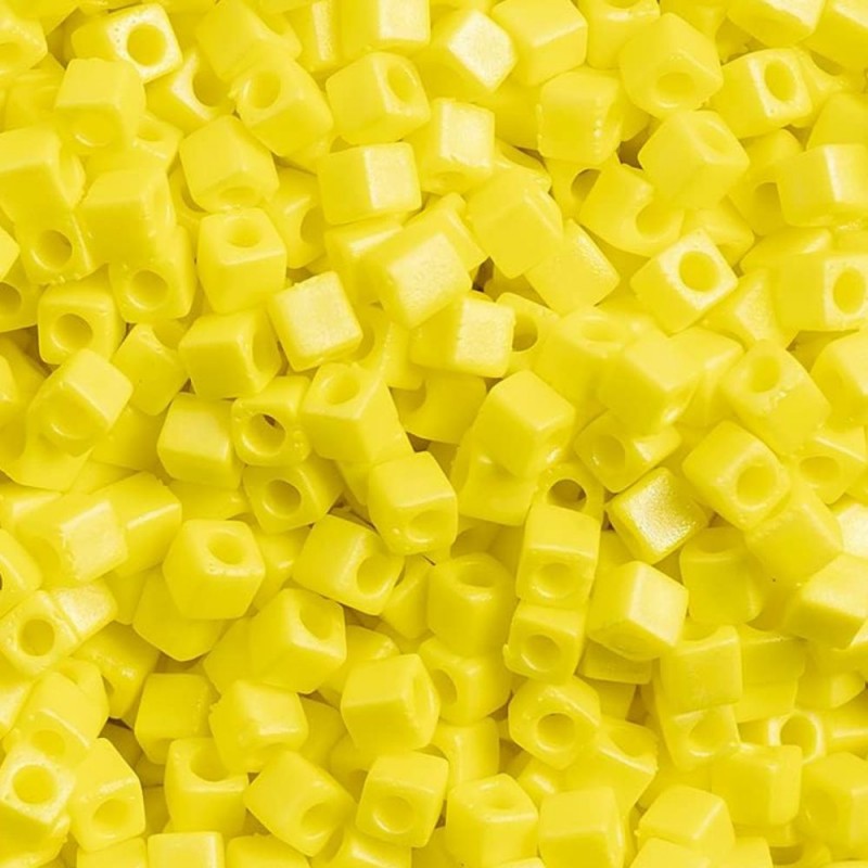 Cubes de marque Miyuki de 3 mm de couleur Opaque Yellow. Les moyeux sont uniformes et ont un trou traversant de 1,5 mm.