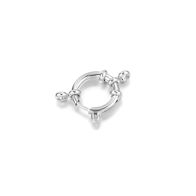 Fermoir bouée 14 mm en acier inoxydable avec deux anneaux doubles dont chaque anneau mesure 4 mm de diamètre. La longueur totale des deux anneaux est d'environ 8 mm et leur épaisseur est de 1,8 mm..
