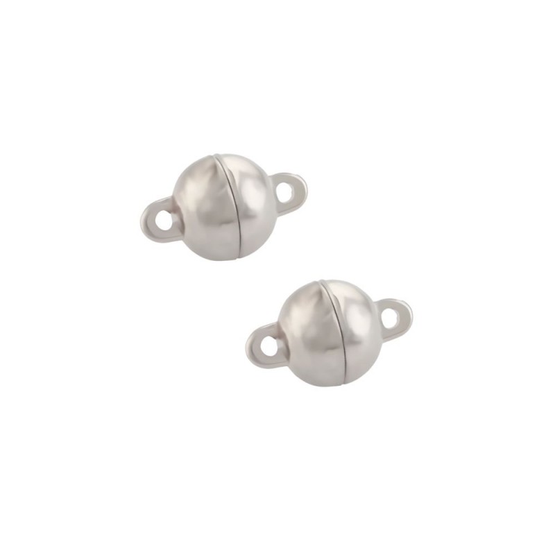 Fermeture aimantée ronde en cuivre laqué argent, de 8 mm de diamètre. Pour le montage, nous recommandons d'utiliser un filetage de 0,8 mm.