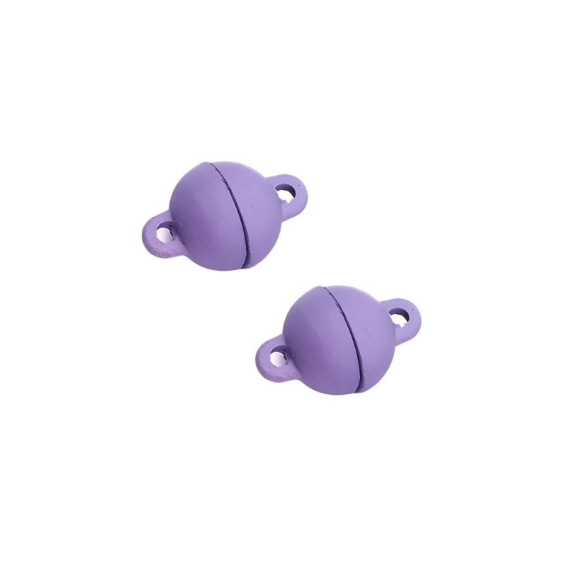 Fermeture aimantée ronde en cuivre laqué lilas, de 8 mm de diamètre. Pour le montage, nous recommandons d'utiliser un filetage de 0,8 mm.