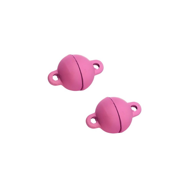 Fermeture aimantée ronde en cuivre laqué fucsia, de 8 mm de diamètre. Pour le montage, nous recommandons d'utiliser un filetage de 0,8 mm.