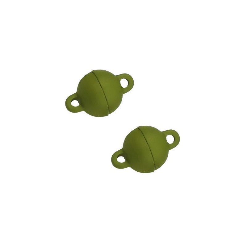 Fermeture aimantée ronde en cuivre laqué vert militaire, de 8 mm de diamètre. Pour le montage, nous recommandons d'utiliser un filetage de 0,8 mm.